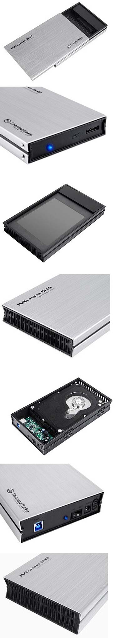 Изделия Muse 5G бывают двух видов - одни предназначены для 3.5" накопителей, другие для 2.5" (в этом случае максимальная толщина ограничена 12.5мм). Подключение (внутреннее) идёт по SATA I/II/III, а к ПК Muse 5G подключаются уже по USB 3.0. Изделия Thermaltake сделаны из алюминия, что служит своего рода радиатором для накопителя, находящегося внутри. На корпусе Muse 5G имеются светодиоды, что показывают активность накопителя.
