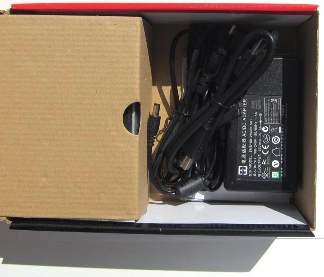 В левой части коробки (на фото - в правой) лежит адаптер питания, состоящий из двух частей, да USB 3.0 кабель (увы, длина его невелика, как и у прочих продуктов AgeStar, что такими кабелями укомплектовываются):