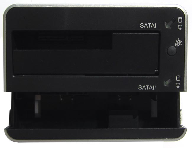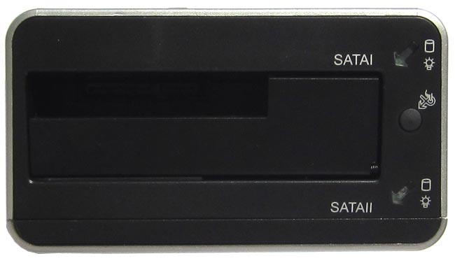 Кстати о функции дублирования информации. Устройство предоставляет возможность записи данных с одного накопителя (что вставлен в слот SATA I) на другой (который в SATA II). Копируется содержимое диска полностью, так что нужно позаботиться о том, чтобы ёмкость накопителя номер один была меньше (или равной) ёмкости накопителя номер два.