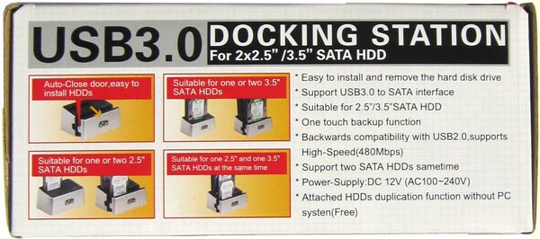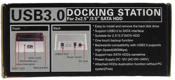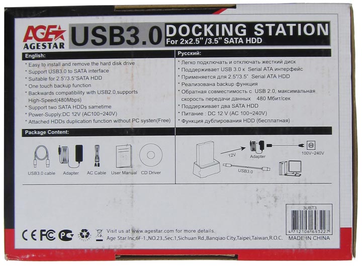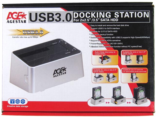 На фронтальной части коробки крупным шрифтом указано, что подсоединяется девайс к ПК по USB 3.0. Несомненно, это большой плюс устройства AgeStar, ибо подключая винчестер по USB 2.0, прыти от него не дождаться. Что уж говорить о подключении к ПК двух накопителей по USB 2.0? А вот с USB 3.0 проблем не будет, пропускная способность данного интерфейса позволяет по-полной использовать пару любых винчестеров и даже SSD (впрочем, последние вряд ли будут работать на полную, особенно SATA 6Гб/с модели).