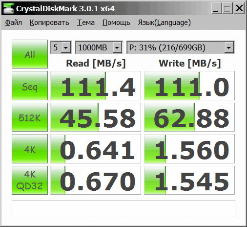 Следующий бенчмарк - CrystalDiskMark, в нём запускались все тесты: