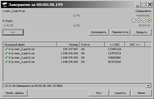 Первым на очереди идёт самый простой для любого накопителя тест - копирование нескольких объёмных файлов. Для этих целей я взял ранее созданный многотомный RAR архив с фильмом "Люди Икс 2" (720p) внутри, всего 4 файла, общий вес - 3.45 ГБ (3 715 975 967 байт). Копирование происходило с SSD на винчестер посредством программы TeraCopy, которая после копирования выдаёт общее время, затраченное на операцию, а также среднюю скорость передачи данных.