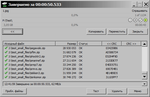 С немалым количеством файлов 3UBT3 справился за 50 секунд, скорость была в районе 62МБ/с.