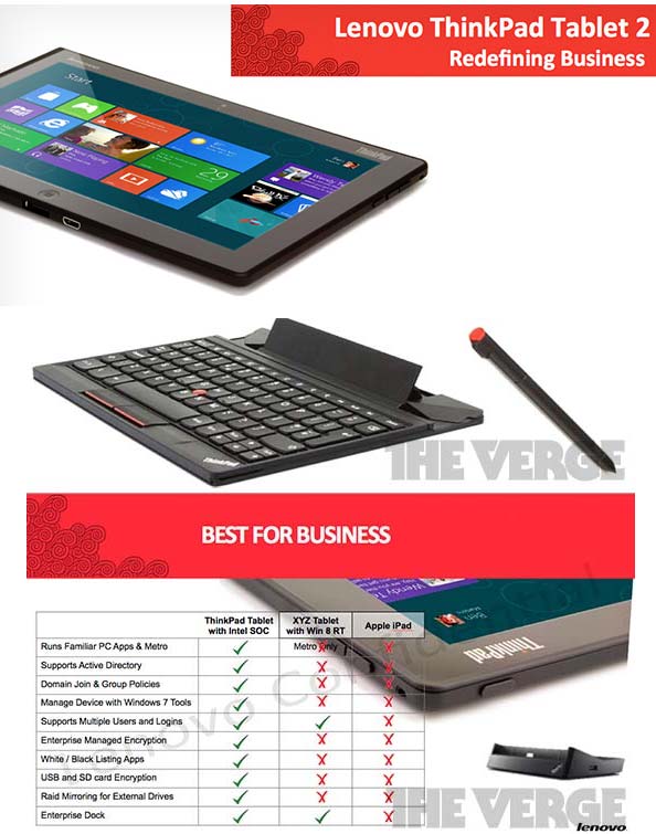 Изделие носит простое и понятное название - ThinkPad Tablet 2. В его основе двухъядерная система на чипе (SoC) Intel Clover Trail, 2ГБ оперативной памяти и 64ГБ места на встроенном накопителе. Данное изделие будет управляться Windows 8 и нацелено на бизнес применение.