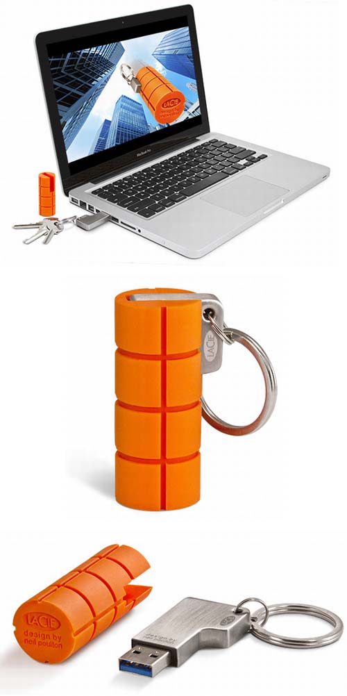 Новое творение LaCie и вправду крепкое - а всё благодаря своему прорезиненному оранжевому колпачку (в котором она вся и помещается), дизайном которого занимался Нил Полтон. Данная флешка может падать без негативных для себя последствий с высоты до 100 метров, также она легко справляется с высокими и низкими температурами (точные данные по ним не указаны).