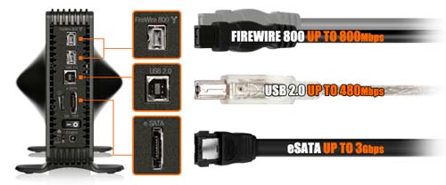 Новинка имеет даже встроенный контроллер скорости вращения вентилятора, так что можно выбрать между автоматическим, производительным и тихим режимом работы 80мм "карлсона". Подключение к ПК или иному устройству осуществляется не по USB 3.0 (как у MB080U3S-1SB), а по USB 2.0, зато есть возможность задействовать и два FireWire 800, ну и eSATA (что есть у обеих моделей), поддерживаются накопители с SATA всех поколений, максимальная ёмкость - 3ТБ. Заявлена поддержка как ПК, так и Мак. Габариты: 237.5x126x146мм, вес - 646 граммов.