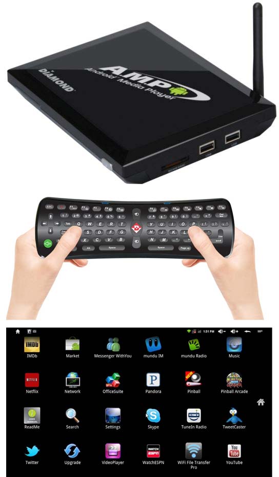 Аппарат от Diamond поддерживает воспроизведения многочисленных медийных файлов (в том числе Adobe Flash), доступ в Интернет по WiFi, возможность загрузки с Google Play Store разного рода приложений. Пульт дистанционного управления (на деле это QWERTY клавиатура), что прилагается к AMP1000, можно использовать в качестве геймпада и с его помощью гонять игрушки (я бы попробовал различные эмуляторы под Android). Кому такой гейминг не по душе, по USB можно подсоединить и другие манипуляторы (или какие-то устройства иного рода).