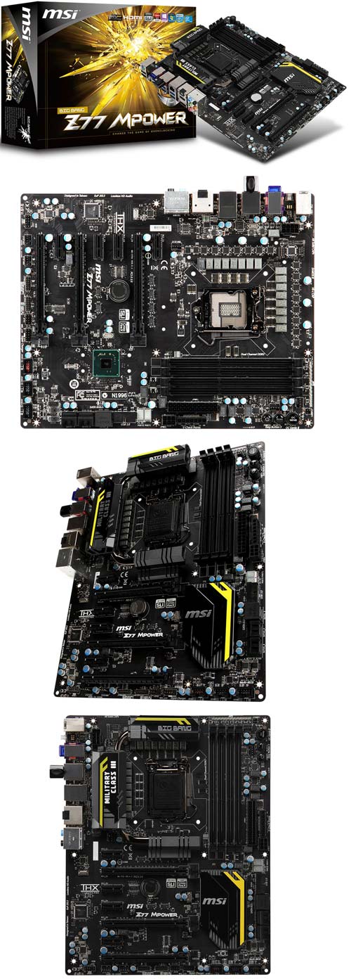 Видеовыходы имеются следующие: HDMI и DisplayPort, в Сеть новинка выходит либо через гигабитный сетевой порт, либо по WiFi 802.11b/g/n. Big Bang Z77 MPOWER поддерживает и Bluetooth 3.0 + HS. Игровой компьютер на данном продукте MSI можно построить завидной мощности, ведь тандемы SLI и Crossfire соорудить не составит труда. Творение MSI имеет поддержку звуковой технологии THX TruStudio Pro, звук 8-и канальный.