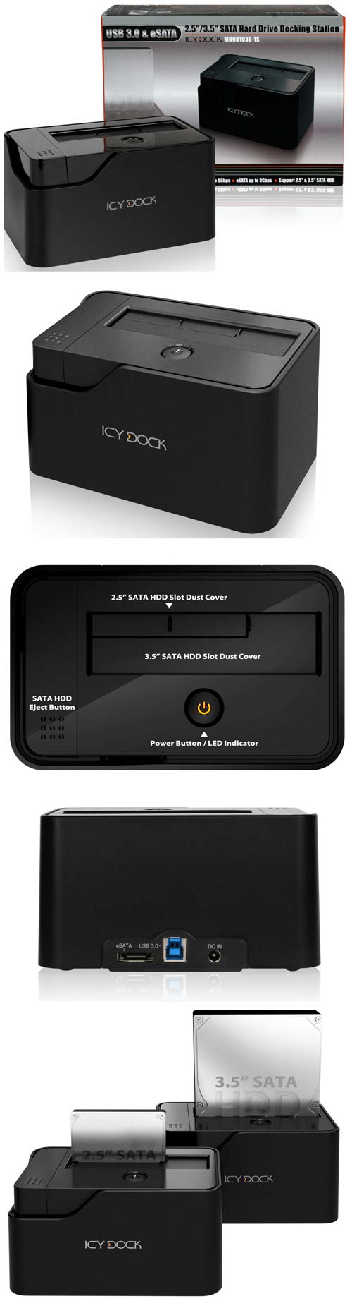 Док-станция называется MB981U3S-1S, она предназначена для помещения в себя одного 2.5" или же 3.5" SATA накопителя. После того, как винчестер/SSD/гибрид будет вставлен в устройство от Icy Dock, док-станцию можно будет подключить в USB 3.0 или же eSATA порт компьютера или ноут/нет/ультрабука. Забавно это обыграно в пресс-релизе - мол даже если у вас не самый новый ПК с USB 3.0, а нечто двухгодовалой давности с eSATA, а то и что-то из 90-х (!) с USB 2.0 (хотя тогда им и не пахло, ведь USB 2.0 внедрён в 2000 году), то MB981U3S-1S подойдёт в каждом из этих случаев.