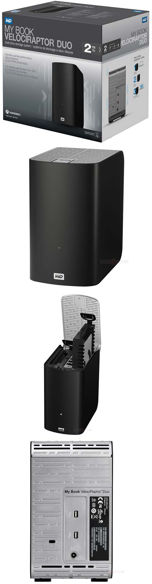 Каждый из "Велоцирапторов" имеет скорость вращения шпинделя в 10000 об/мин, потому два таких накопителя могут показывать скорость передачи данных в 400МБ/с. Подключение осуществляется по Thunderbolt, таких портов у My Book VelociRaptor Duo два. Предназначено устройство для использования с компьютерами, работающими под управлением Mac OS X, однако новинка от WD будет функционировать и с ПК, у которых есть нужный порт. Не помешал бы устройству один (а лучше два) USB 3.0 порт, всё же распространённость этого интерфейса куда более широкая, чем у Thunderbolt.