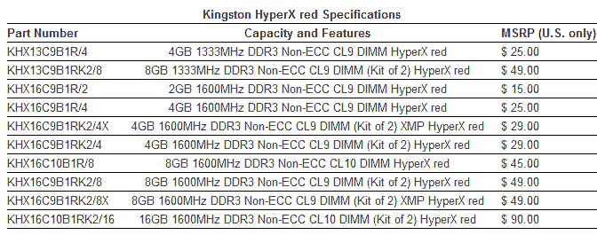 Что нам поведали о новых модулях DDR3 памяти HyperX red? Да всё подряд - купить новые модули можно как по-одному (2, 4 и 8ГБ), так и наборами (от 4 до 16ГБ). Скорость лежит в пределах от 1333Мгц до 1600МГц, тайминги установлены либо 9-9-9-27, либо 10-10-10-30, рабочее напряжение - или 1.5 или 1.6 вольта. Поддержка Intel XMP есть у всех моделей, заявлена совместимость с чипсетами как AMD (A75, A87, A88, A89, A78 и E35), так и Intel ( P55, H67, P67, Z68, Z77 и H61). Каждый модуль тестируется на заводе на 100%, если верить Kingston.