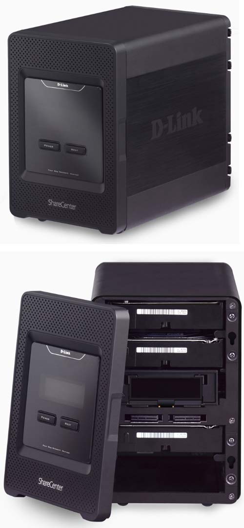В изделие можно запихать накопителей (3.5", SATA) общей ёмкостью 16ТБ, т.е. 4 штуки по 4ТБ. Два гигабитных Ethernet порта DNS-345 позволят получать доступ к содержимому накопителей по локальной сети. Можно приспособить девайс и для видеонаблюдения - поддерживается воспроизведение видео с IP камер (4 штуки - максимум). Винчестеры/SSD можно объединить в RAID массивы, всего доступно семь вариантов. Использовать девайс в качестве принт-сервера также возможно, благо USB порт имеется.