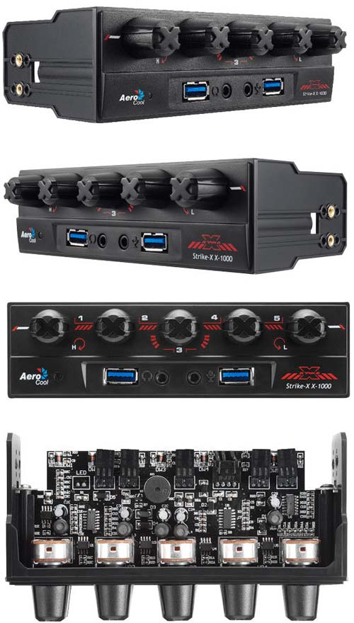 Изделие называется X-1000 и относится к семейству устройств Strike-X. Новинка представляет собой реобас, способный управлять скоростью вращения пяти вентилятором одновременно. Устанавливается реобас в 5.25" панель ПК, управление скоростью вращения "карлсонов" осуществляется посредством пяти ручек (с буквой Х на каждой, что на мой взгляд портит облик изделия), по каждому каналу новинка от AeroCool может подавать до 25 ватт питания.