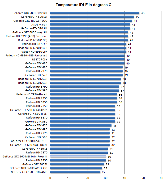 Поглядим на рабочие температуры MSI GeForce GTX 660 Twin Frozr III, как в простое, так и в нагрузке: