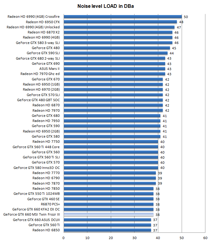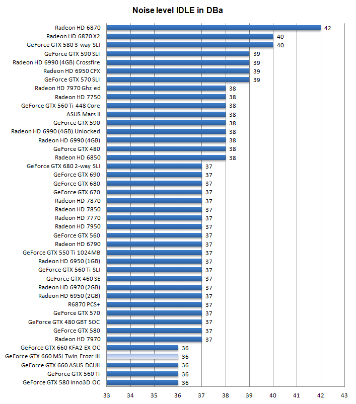 Уровень шума, издаваемый системой охлаждения видеокарты MSI GeForce GTX 660 Twin Frozr III