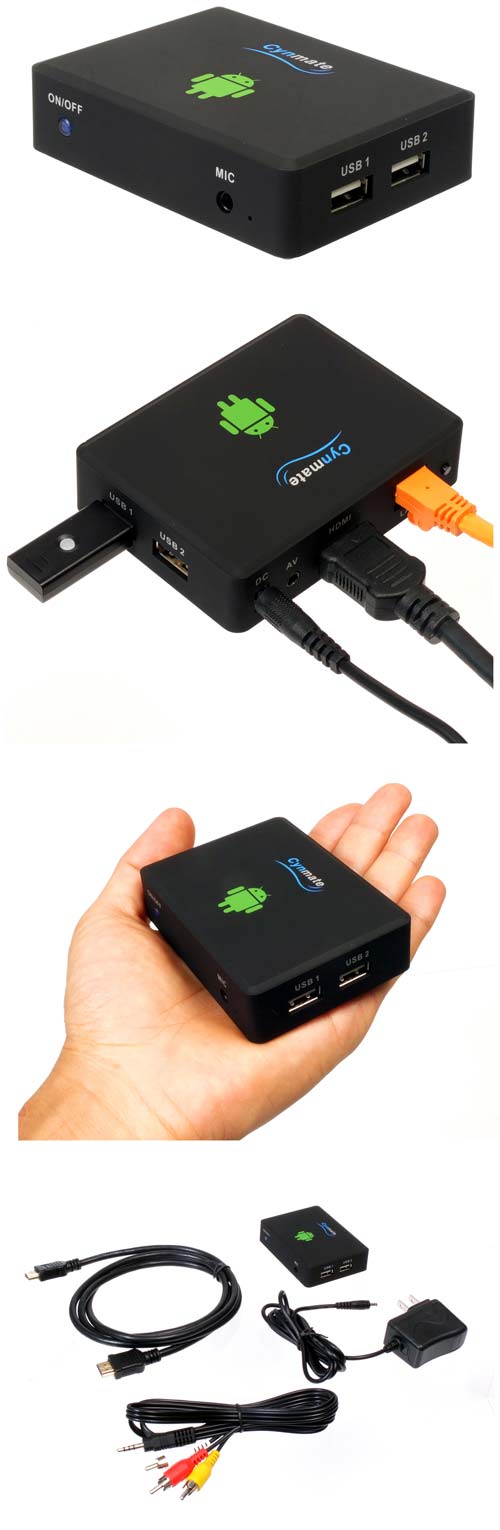 Габариты новинки составляют 87х66х24мм, весит устройство Android SmartTV BOX (ANDBOX44) 80 граммов. Питание медиаплеера осуществляется от электросети, а подключается новинка в HDMI 1.3 порт телевизора или же монитора/иного устройства, хотя можно задействовать композитный видеовход.