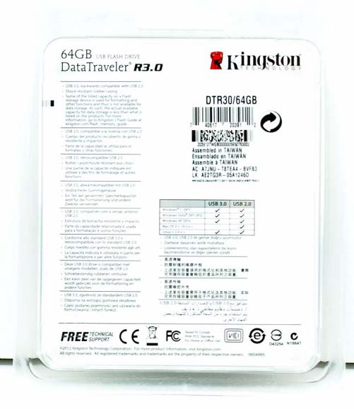 Как видно, это обычный блистер. Такой вид упаковки можно назвать стандартом де-факто для USB Flash устройств. Kingston приняла мудрое решение сделать упаковку флешки DataTraveler Rubber 3.0 информативной - на лицевой части блистера видны скоростные спецификации изделия. Сообщается, что скорость чтения данных составляет 70МБ/с, а записи - 30МБ/с. Из спецификации флешки с сайта Kingston следует, что при USB 2.0 подключении, данный накопитель демонстрирует 30МБ/с на чтение и 25МБ/с на запись.