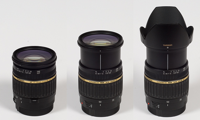 Во время изменения фокусного диапазона от 17 мм до 50 передняя часть (так называемый хобот) выдвигается вперед миллиметров на 35-40. Но учитывая общую компактность объектива, дискомфорта это не вызывает. Длинна объектива на фокусном расстоянии 17 мм составляет 84 мм, а ширина – 74 мм.