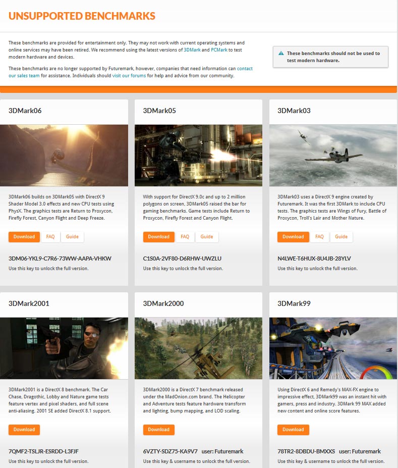 Компания Futuremark, из под пера которой вышли легендарные тестовые пакеты 3DMark и PCMark, предлагает скачать не поддерживаемые отныне ею версии этих (и кое-каких ещё) программ абсолютно бесплатно, легальные регистрационные данные (имена и ключи) прилагаются!