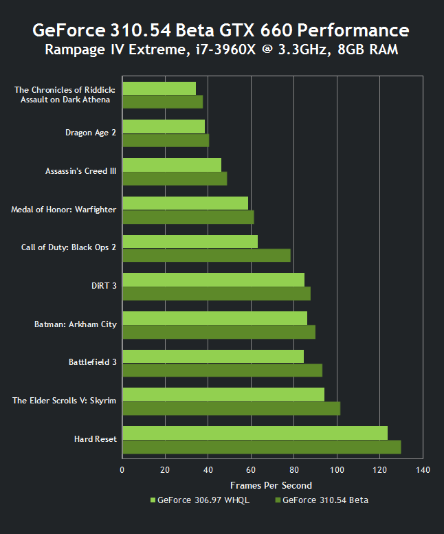 - Performance Boost – Increases performance for GeForce 400/500/600 Series GPUs in several PC games vs. GeForce 306.97 WHQL drivers. Results will vary depending on your GPU and system configuration: