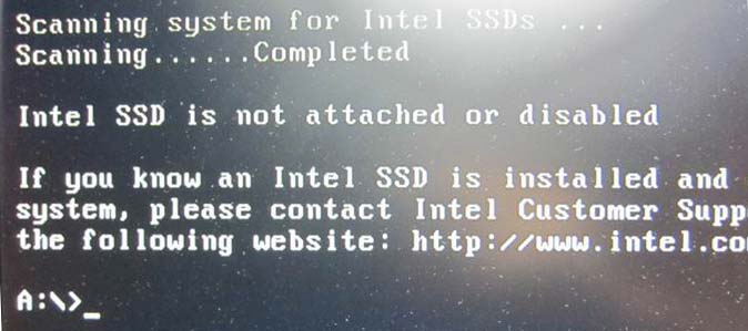 Я недолго думая решил обновить прошивку своего 160ГБ SSD 320 серии (ведь не хочется ненароком словить "8МБ баг"), предварительно сделав бэкап всего содержимого накопителя средствами Acronis True Image. Идём дальше - для обновления SSD мне понадобился сам файл-образ прошивки 0811036202M388208850.ISO, его я скачал с сайта Intel, да программа для записи образов на болванки - BurnCDCC. Записав болванку, я перезагрузил компьютер, выбрал в качестве загрузочного устройства мой DVD-привод и после пары нажатий Y/Enter (на вопросы в стиле "а Вы читали то-то и то-то?" и "а Вы согласны с тем-то и тем-то?") я получил вот такую вот "радость":