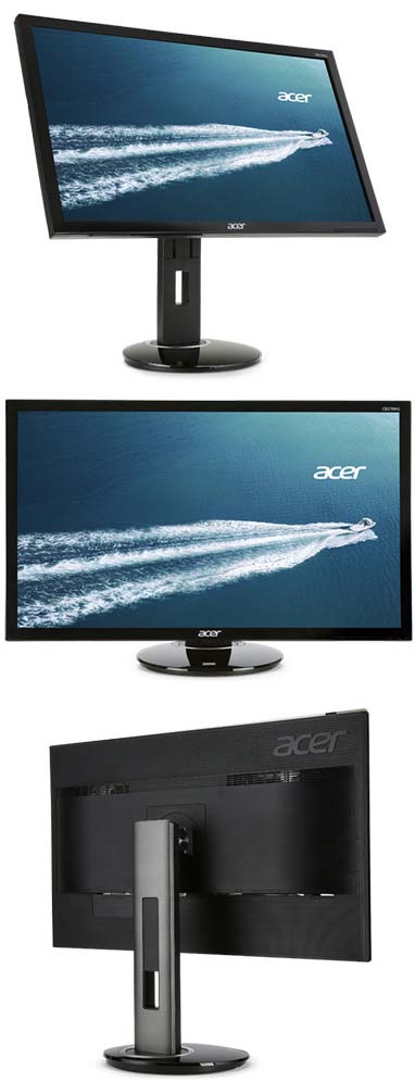 Творение Acer имеет углы обзора по горизонтали в 170 градусов и 160 градусов по вертикали. Монитор подойдёт для игр некритичным к показателю Гц людям, т.к. обладает временем отклика в 1мс (g2g). Из видеовходов имеются DisplayPort, Mini-DisplayPort, DVI и HDMI/MHL. Новинка может похвастаться подставкой, позволяющей вертеть и крутить дисплей, менять его высоту и угол наклона так, как угодно пользователю (но в допустимых пределах). В изделие встроена пара 2-ваттных динамиков.