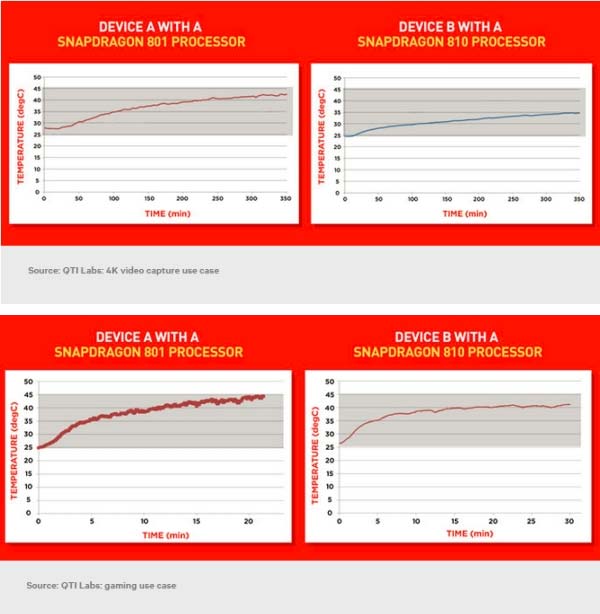 Как видно из графиков, температура оснащённого Snapdragon 810 аппарата оказалась даже ниже, чем у базирующегося на Snapdragon 801 аппарата, 40 градусов по Цельсию против 45° (тест с просмотром видео в 4K). Разумеется, эти данные не являются истиной в последней инстанции и итоговые температуры могут различаться в материалах с других сайтов или же просто полученных на других аппаратах связи с теми же SoC.