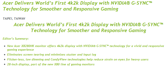 Новинка получила имя XB280HK, она имеет разрешение экрана 4K (3840x2160) и ограниченную поддержку G-Sync. Почему ограниченную? Полноценный G-Sync включает в себя ULMB (то самое устранение размытости объектов в движении), творение Acer её не имеет. Также, аппарат обладает лишь 60Гц развёрткой, так что насладиться плавностью картинки по-полной не получится. Впрочем, с G-Sync и 60Гц смотрятся отлично, если верить очевидцам.
