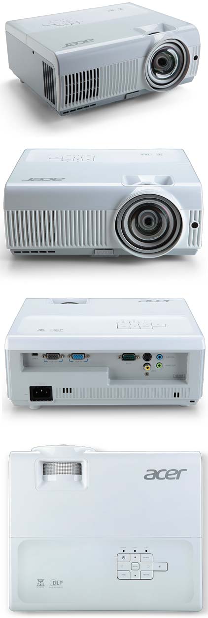 Судя по спецификациям новинки от Acer, она способна выдавать 3D изображение, так как поддерживает 120Гц развертку. В корпус аппарата встроен 2-ваттный моно динамик. Размеры S1212 составляют 104x272x229мм, вес равен 2.79КГ.