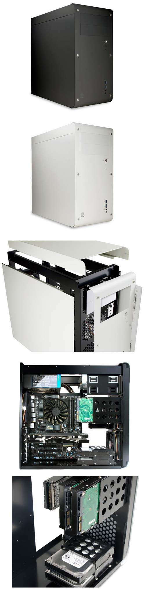 Сообщается, что боковые стенки корпуса имеют матовое покрытие, потому следов от пальцев на них не остаётся. Количество 5.25" отсеков равно двум, 3.5" отсеков пять (корзин две, они съёмные и расположены довольно интересно, советую посмотреть фото ниже), плюс есть возможность установки пары 2.5" устройств.
