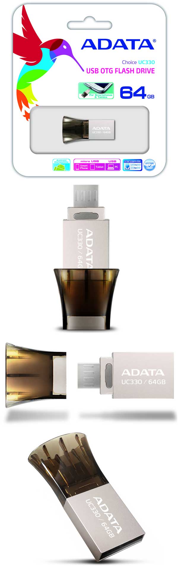 Ёмкость аппаратов серии составляет 8, 16 и 32ГБ, заявлена совместимость с On-the-Go (OTG), в комплекте с агрегатами идёт софт OStoGO и UFDtoGO. Цвет устройства - серебристый, корпус сделан из сплава цинка, при изготовлении накопителя была задействована технология chip-on-board (COB), так что Choice UC330 не боится воды и падений.