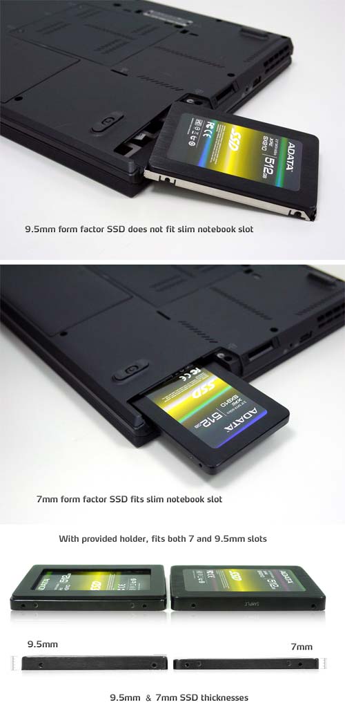 Толщина обычного жесткого диска форм-фактора 2.5” составляет 9,5 мм. Однако в связи с текущей тенденцией к созданию более тонких и легких ноутбуков производители предъявляют новые конструктивные требования ко всем компонентам ПК, в особенности к жестким дискам. Новые SSD-накопители ADATA тоньше своих предшественников на 26% и при этом ничуть не уступают им по скорости, емкости или надежности. Компания ADATA остается верна своему принципу предлагать конкурентные решения, максимально удовлетворяя разнообразные запросы рынка. В частности, новые SSD-накопители поставляются в комплекте с пластиковыми расширителями, позволяющими установить их и в традиционные отсеки для 9,5-миллиметроовых дисков.