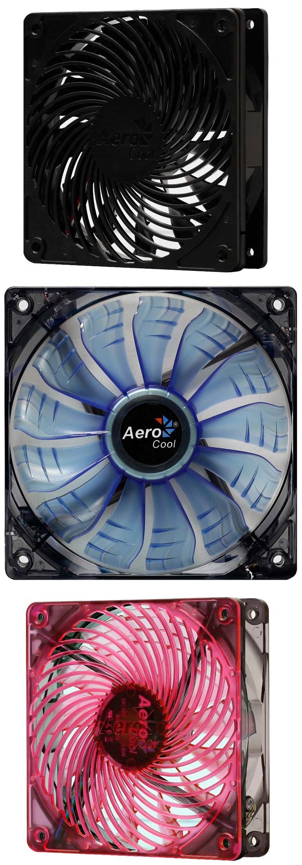 Серия новинок получила имя Air Force ("воздушная сила"), в неё вошли как вентиляторы типоразмера 120x120x25мм, так и 140x140x25, обе представлены в нескольких цветовых вариантах, в том числе с LED подсветкой (и без неё тоже). Перед созданием данной серии "карлсонов" компания Aerocool поставила перед собой практически несбыточную цель - обеспечить сильный воздушный поток при малом уровне шума. Это, якобы, обеспечивается особой формой лопастей вентиляторов.