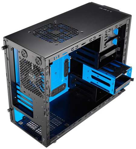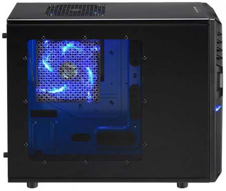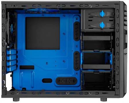 Шасси обладает двумя отсеками под 5.25" девайсы, шестью местами под 3.5" винчестеры (причём одна из корзин под это дело снимается, что даёт возможность установить видеокарту длиной до 390мм), боковым прозрачным окошком, двумя предустановленными вентиляторами (120мм/26.5 децибел на задней стенке и 140мм/29.6 децибел - на передней), а также отверстиями для шлангов системы жидкостного охлаждения. В корзины для винчестеров можно установить два 2.5" накопителя, а на передней верхней панели корпуса имеются USB и аудио порты. Слотов расширения у шасси четыре штуки, дополнительных места под вентиляторы - 2 (на 120/140мм), цвет корпуса - чёрный снаружи и внутри, правда интерьер шасси разбавлен голубым цветом (по заверению производителя это сделано для придания уникального внешнего вида изделия), расположение блока питания - нижнее. Имеются вполне приличные возможности для организации кабель-менеджмента (отверстия под провода в материнской плате обрезинены).