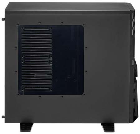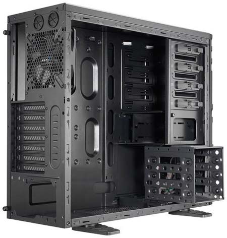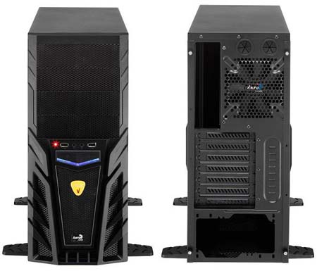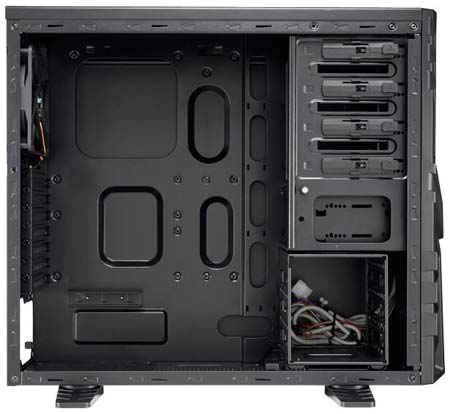 Корпус покрашен в чёрный цвет и внутри и снаружи, в него безо всяких дополнительных инструментов (т.е. голыми руками) можно установить те самые 5.25" девайсы, а также видеокарту и винчестеры. Кстати о видеокарте - в новинку от Aerocool преспокойно влезет видяшка длиной до 29 сантиметров (т.е. с той же GTX 580 проблем не будет, а вот Radeon HD 6990 не влезет), ну а если снять корзину для винчестеров - то поместится и 430мм видеокарта, если, конечно, такое чудовище когда-либо будет выпущено в свет (надеюсь, что этого не произойдёт - иначе бред какой-то получится, кому нужна ~полуметровая видяха?!). Если же корзину для накопителей не вынимать, то стандартных винчестеров в данный корпус влезет шесть штук.