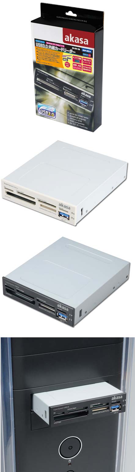 Устройство AK-ICR-13A является внутренним картридером, который помещается в 3.5" отсек корпуса ПК. Владельцу он предоставляет возможность для полноценной работы с карточками памяти следующих форматов: SD / MMC, microSD, MS, M2 и CF / MD.