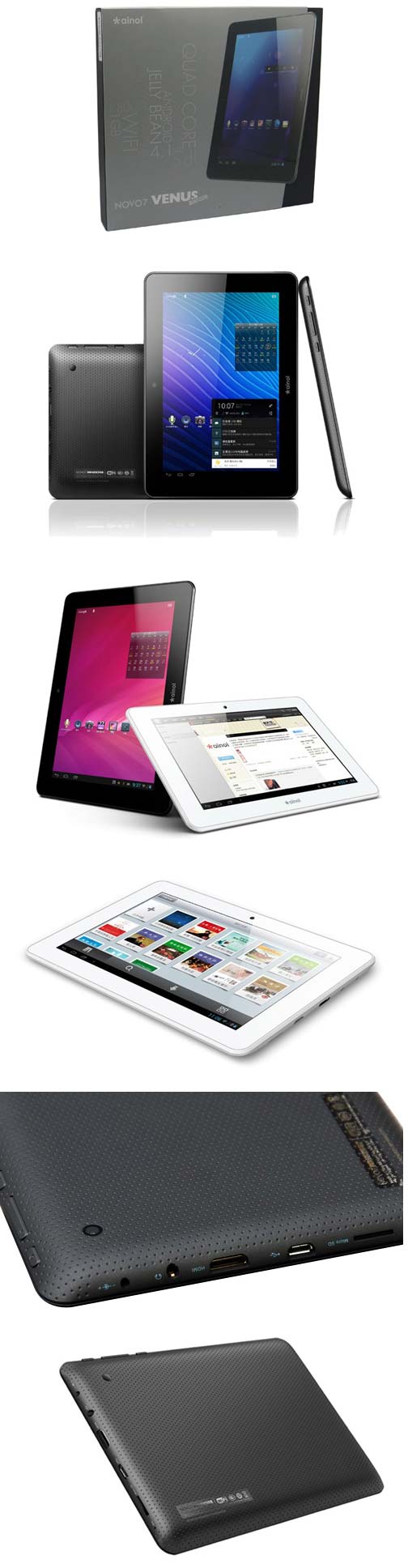 Планшетник Ainol NOVO7 Venus/Myth обладает G-сенсором, поддерживает 802.11b/g/n (150Мб/с), но не имеет Bluetooth модуля. У него есть Mini-HDMI порт, micro USB, а также 3.5мм "джек" на наушники. Время работы от 4000 мАч литиевой батареи - 8 часов, управляется новинка Android 4.1.1, весит 320 граммов.