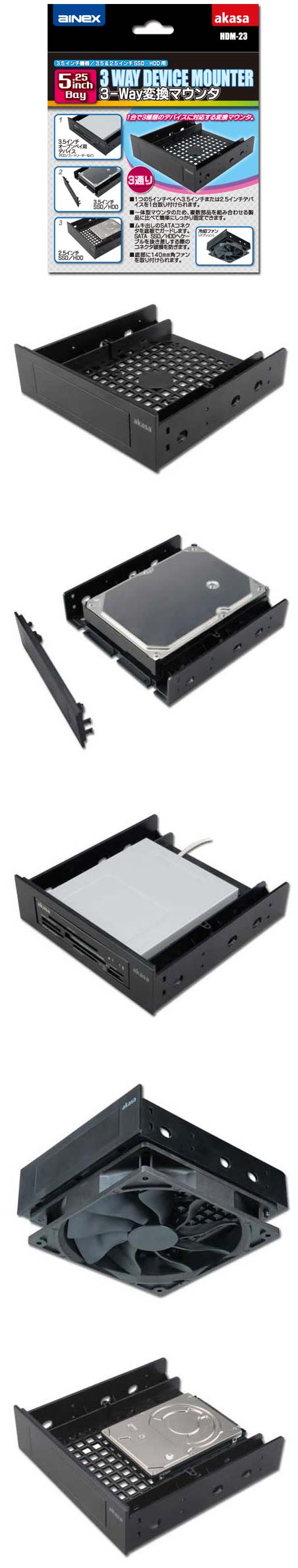 Устройство представляет собой переходник, с помощью которого можно в 5.25" отсек поместить 3.5/2.5" накопитель или же картридер, да ещё и организовать ему обдув 140мм вентилятором. Правда не ясно, есть ли сам "карлсон" в комплекте, но на фотографиях к продукту он присутствует. Габариты новинки составляют 149x154x42мм.