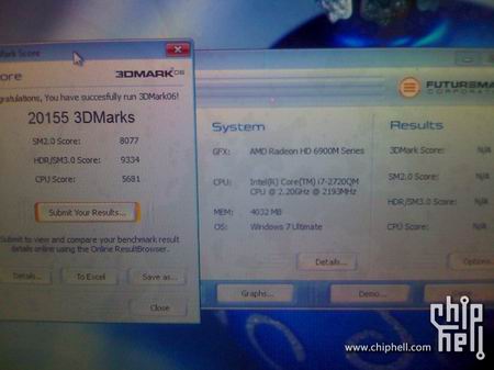 Китайские коллеги поделились результатами теста в 3DMark 2006 одной из конфигурация ноутбука (стоит отметить, что видеокарта - мобильная версия Radeon 69xxM):