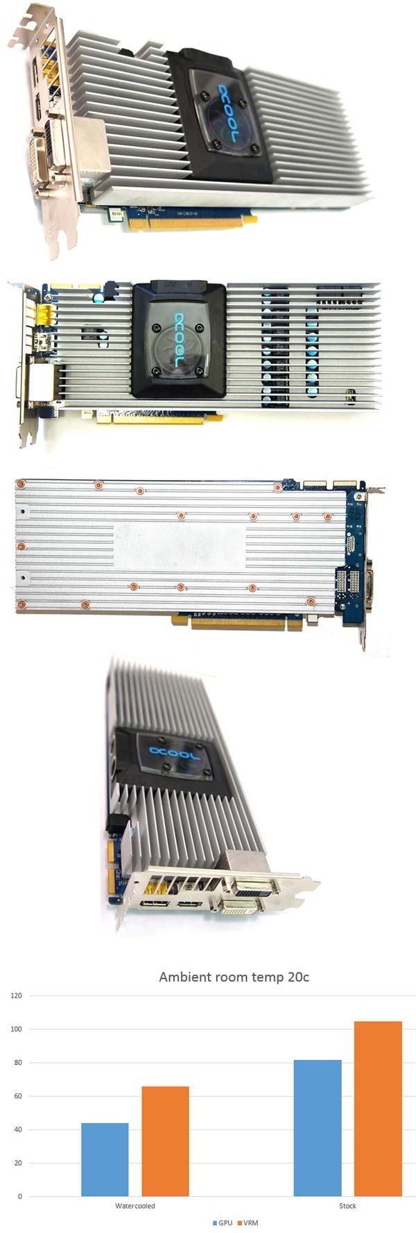 Как видно по графику выше, новый водоблок соревновался в эффективности со стоковым кулером. Разумеется, учитывая многократную разницу в стоимости и классе устройств, продукт AlphaCool вышел из битвы победителем. Во время тестов температура на графическом ядре карточки была в районе 54 градусов по Цельсию, а на мосфетах - 76°.