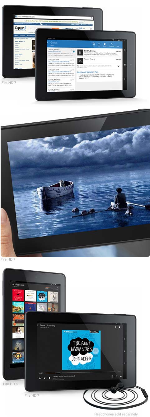 Новый аппарат по всему проще названного выше агрегата, но назвать Fire HD 7 примитивным никак нельзя. Устройство обладает 7" IPS экраном с разрешением 720p, использует 4-ядерную 1.2ГГц SoC неизвестно чьего производства, 8 или же 16ГБ флеш памяти. Размеры планшета: 191x128x10.6мм, вес равен 337 граммам.