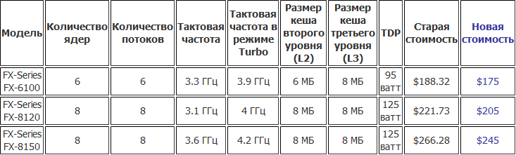 Причины столь приятного события нам не так важны, главное тут то, что поступили сведения о снижение стоимости трёх процессоров семейства FX. Привожу старую, но несколько изменённую табличку: