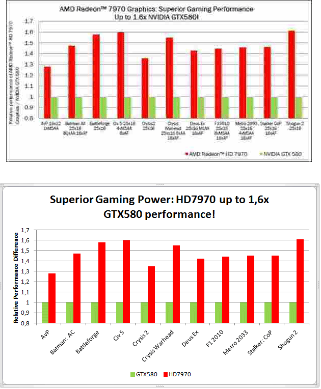 Первый график - оригинал, высылаемый AMD, а второй - его копия, сделанная в Excel силами сообщества сайта Tweakers.net. Посмотрим, что там натестируют заморские ревьюверы, будут ли их данные хоть где-то меньше тех, что высылает AMD?