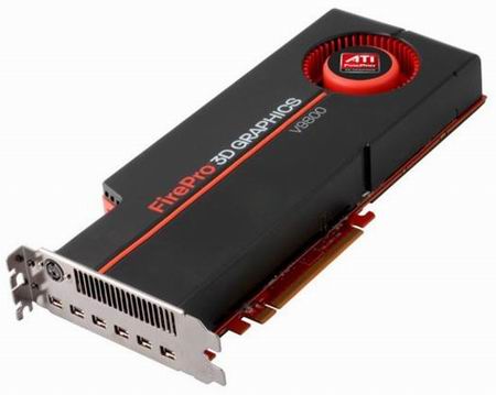 Особо интересной информации тут Вы не найдёте, нет частотных характеристик, нет всего того, что мы привыкли видеть в игровых видеокартах. Информация крайне скупая - у ATI FirePro V9800 4ГБ GDDR5 памяти (интерфейс - 256 бит), 1600 потоковых процессоров, максимальное поддерживаемое разрешение - 2560х1600 при 60Гц. Производительность карты - 2.72 терафлопс, энергопотребление - 225 ватт. Заявлена полная поддержка ATI EyeFinity, DirectX 11, OpenGL 4.0, OpenCL 1.0, стереоскопического 3D и ATI CrossFire Pro.