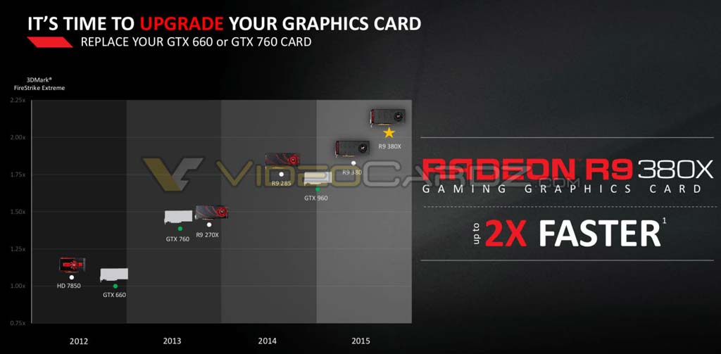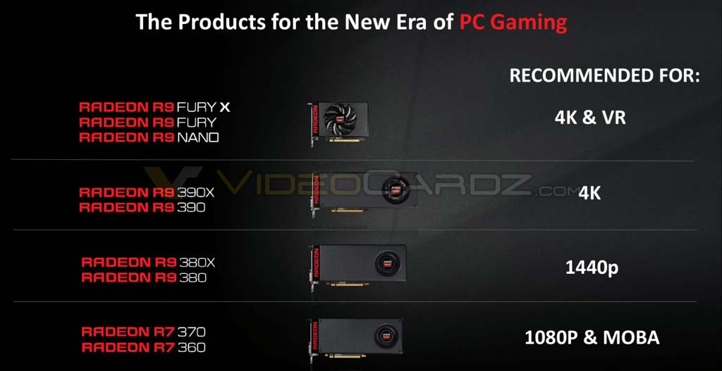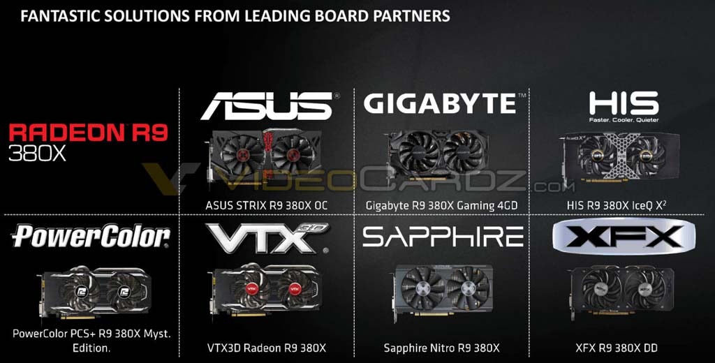 Фото самого решения, слайды из презентации карточки, в том числе с немногочисленными вариантами Radeon R9 380X от партнёров AMD: