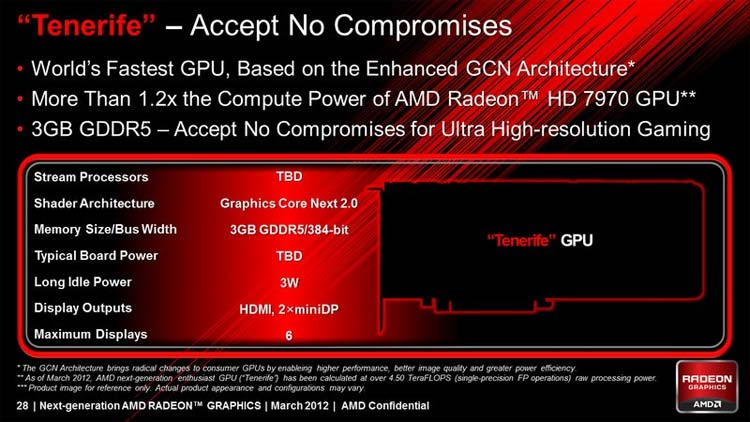 Сказано, что новинка использует продвинутый вариант архитектуры GCN, прозванный EGCN. Известные спецификации: 2304 потоковых процессоров, 384-битная шина, 3ГБ GDDR5 памяти, работающей на 6ГГц, энергопотребление в районе 250 ватт в нагрузке и 3 ватт в простое. Производительность Tenerife, если верить слайду, на 20% превосходит то, на что способна самая быстрая видеокарта на сегодня (одночиповая, разумеется) в лице HD 7970. Впечатляет? Вполне, если учесть что выход решения может состояться ещё в этом году.