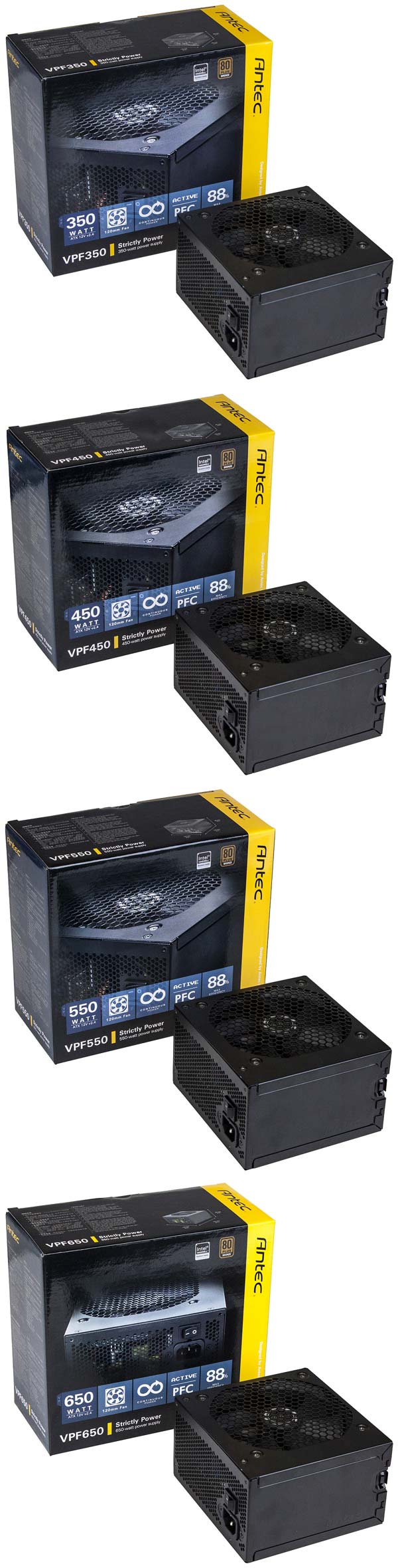 Блок питания VPF имеют мощность 350, 450, 550 и 650 ватт, ими получены сертификаты 80 PLUS Bronze (88%), все они имеют защиту от перенапряжения (OVP), перегрузки блока по суммарной мощности по всем выходам (OPP), перегрузки по току (OCP), короткого замыкания (SCP), пониженного напряжения (UVP), перегрева (OTP) и не только.