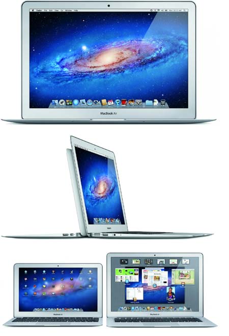 Напомню, что лэптопы семейства MacBook Air относятся к устройствам с особо тонкими (0.68") корпусами и сравнительно малым (1.08 и 1.35кг, в зависимости от диагонали экрана) весом. Моделей представлено четыре штуки, две 11.6" и две 13.3". У всех них есть общие черты: экран с LED-подсветкой (разрешение 1366х768 и 1440х900), полноразмерная клавиатура с подсветкой, процессор Core i5/7 и интегрированное видеоядро Intel HD 3000. Как и у только что представленных мониторов от Apple, у лэптопов имеются порты Thunderbolt, служащие для различных целей. Новинки могут выходить в сеть через 802.11. b/g/n WiFi, имеют поддержку Bluetooth 4.0, обладают парой USB 2.0 портов и камерой FaceTime.