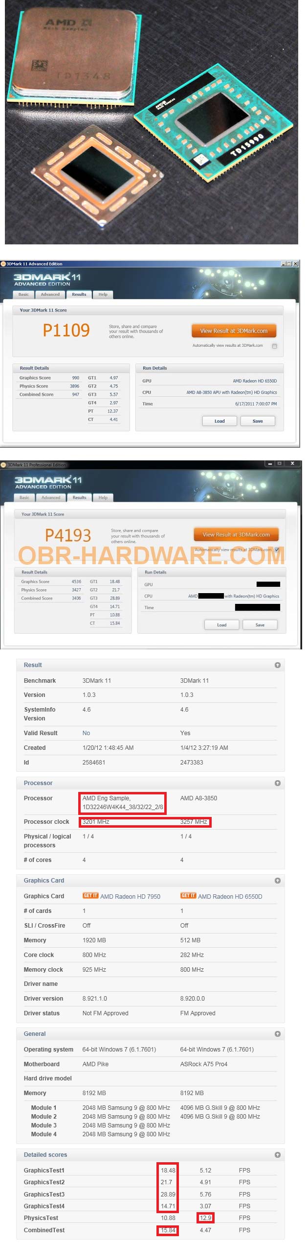 Итак, сначала посмотрим на фото новинки и результаты его выступления в 3DMark 11 по сравнению с старым-добрым Llano в лице A8-3850.