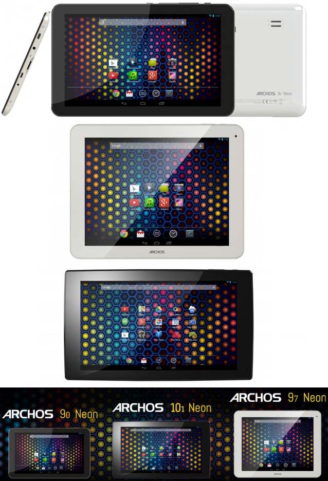Замыкает шествие 10.1" планшет Archos 101 Neon, его тачскрин обладает разрешением 1024x600, SoC имеет частоту 1.4ГГц и четыре ядра, сам аппарат оснащён видеовыходом HDMI. Все три изделия имеют фронтальную камеру, но только у модели 97 Neon есть 2МП тыловая.